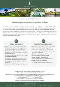 - Idealerweise erste Erfahrungen im Greenkeeping, sowie im Umgang mit golfspezifischen Beregnungs- und Bewässerungsanlagen